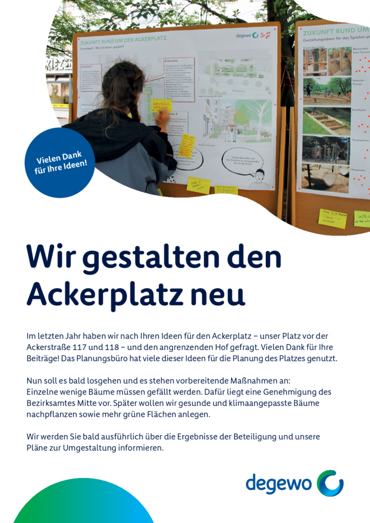 Im letzten Jahr hat die degewo nach Ideen für den Ackerplatz – der Platz vor der Ackerstraße 117 und 118 – und den angrenzenden Hof gefragt. Vielen Dank für die zahlreichen Beiträge! Das Planungsbüro hat viele dieser Vorschläge in die Planung des Platzes einfließen lassen.
