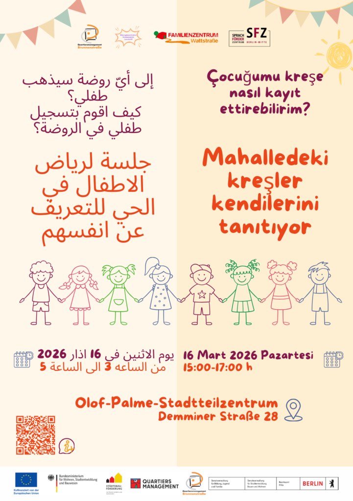 Das Koordinationsteam des Kitaverbund Brunnenviertel lädt ein zur „Kitabörse“ am Montag, 16. März 2026. Hier stellen sich die Kitas aus dem Brunnenviertel vor und stehen für Fragen zu allen möglichen Themen rund um die Betreuung des Kindes zur Verfügung. Mehr Infos folgen hier in Kürze.