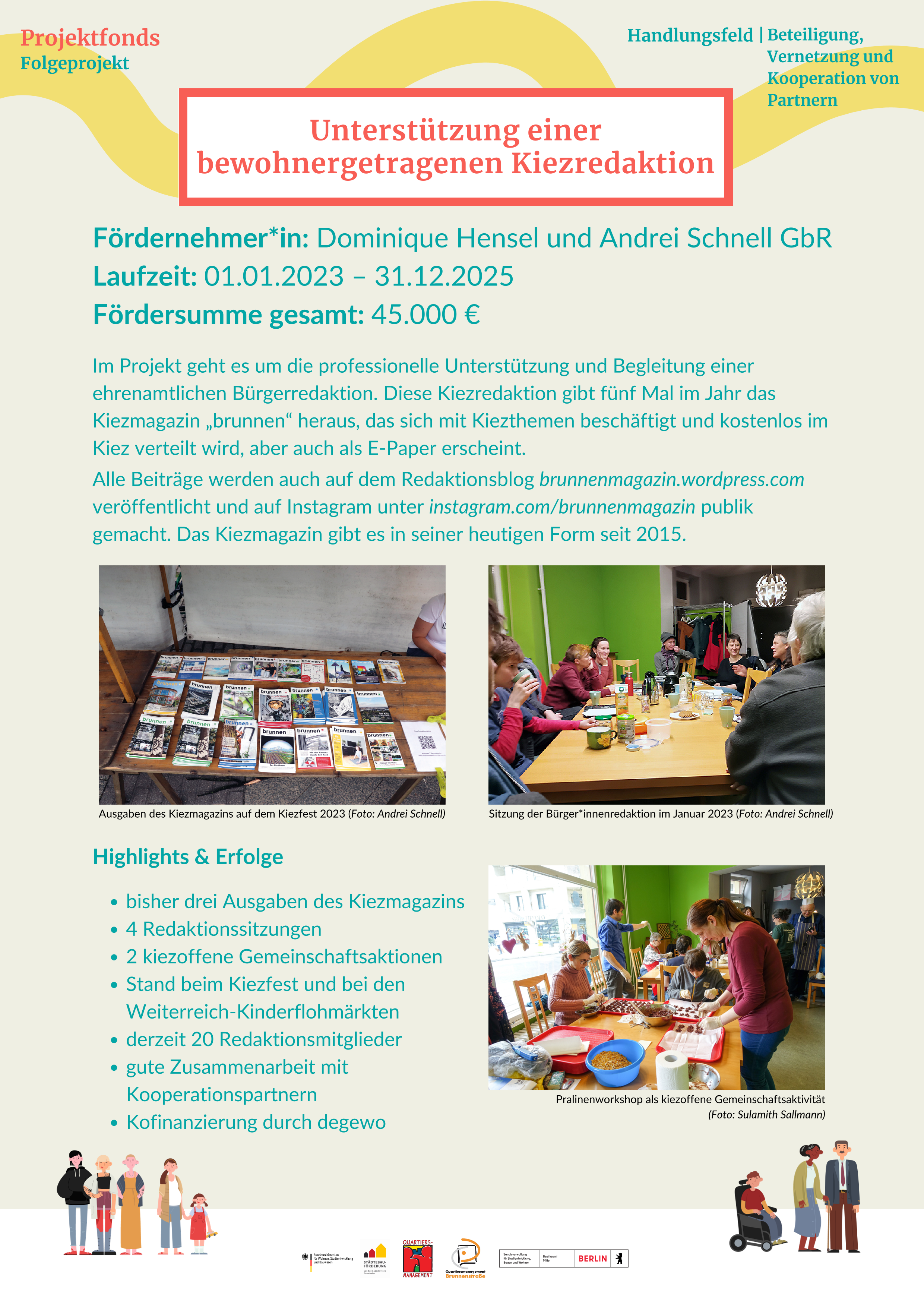 Auf Grundlage des Integrierten Handlungs- und Entwicklungskonzeptes und des Abschlussplans zur Beendigung des QMs werden gemeinsam Schwerpunkte für das Gebiet festgelegt. Daraus werden gemeinsam mit dem Quartiersrat konkrete Projektideen entwickelt. Das QM-Team führt zur Umsetzung der Ideen in Abstimmung mit dem Bezirk und der Senatsverwaltung für Stadtentwicklung und Wohnen sogenannte Projektwettbewerbe durch, um geeignete Träger oder Einzelpersonen für die Umsetzung der Projekte zu finden. Die Projektwettbewerbe werden auf den Seiten des Quartiersmanagement und dem Dachportal der Berliner Quartiersmanagements veröffentlicht. Die Auswahl der/des geeigneten Projektträgers/der Projektträgerin erfolgt durch ein Auswahlgremium, an dem das QM-Team, der Bezirk und interessierte Quartiersräte teilnehmen.