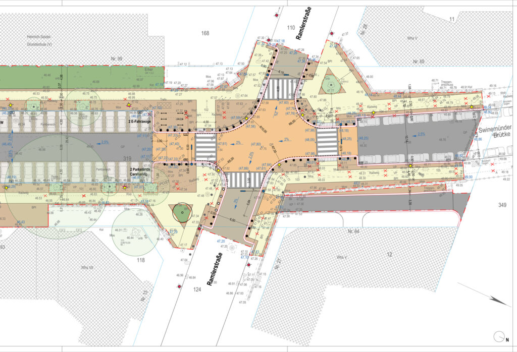 swinemuender bauplanAusschnitt des Plans für den Umbau der Swinemünder Straße. Zu sehen ist die Kreuzung Swinemünder- und Ramlerstraße. Foto: Gruppe Planwerk/Bezirksamt MitteDer Umbau umfasst die Erneuerung der Fahrbahn und der Gehwege, die Installierung von Querungshilfen für Fußgänger und Fußgängerinnen, die Anpassung der Radverkehrsführung sowie die Erneuerung der Beleuchtung auf dem Straßenabschnitt. Mit dem veröffentlichten Plan wird nun die Baugenehmigung beantragt. Die Bürger und Bürgerinnen hatten bereits die Gelegenheit, ihr Wünsche und Einwände vorzutragen. Bei einer Informationsveranstaltung im März 2018 im Rathaus Mitte sowie bei zwei kleineren Veranstaltungen im Kiez wurden Ideen der Anwohnenden aufgenommen.