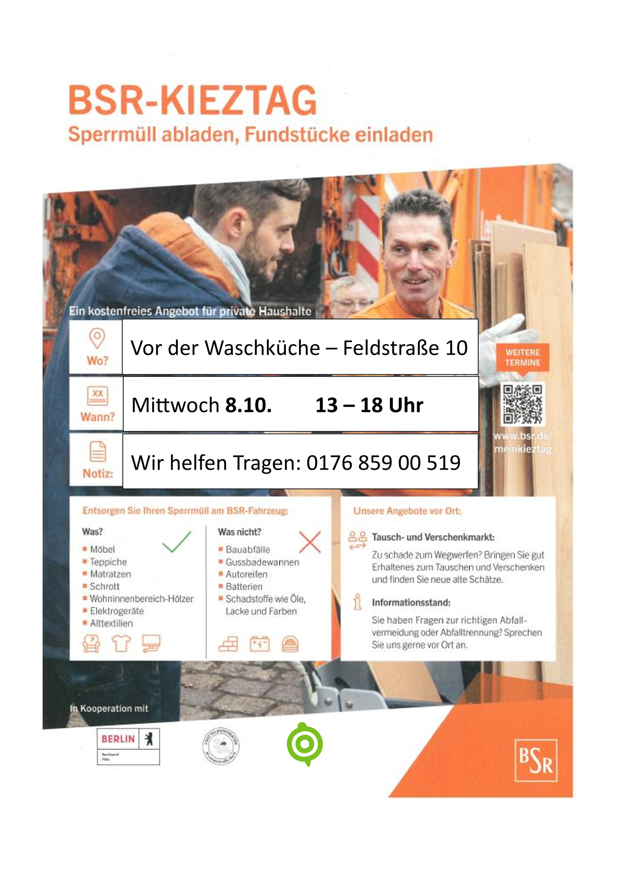 Am Mittwoch, 08. Oktober, von 13 bis 18 Uhr findet der nächste BSR-Kieztag im Brunnenviertel statt.Hier könnt ihr euren Sperrmüll kostenlos abgeben.