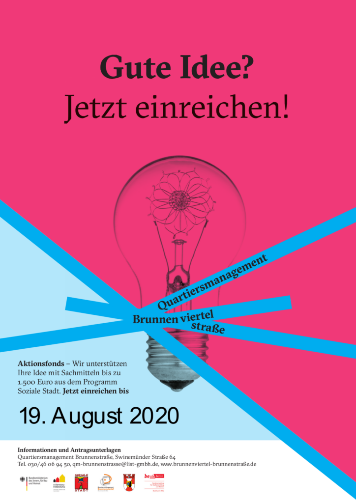 weiter lesenBis zum 19. August können beim Quartiersmanagement Brunnenstraße Ideen für den Kiez eingereicht werden. Kreative Projektideen werden speziell für die Zeiten von Corona für den Aktionsfonds gesucht.